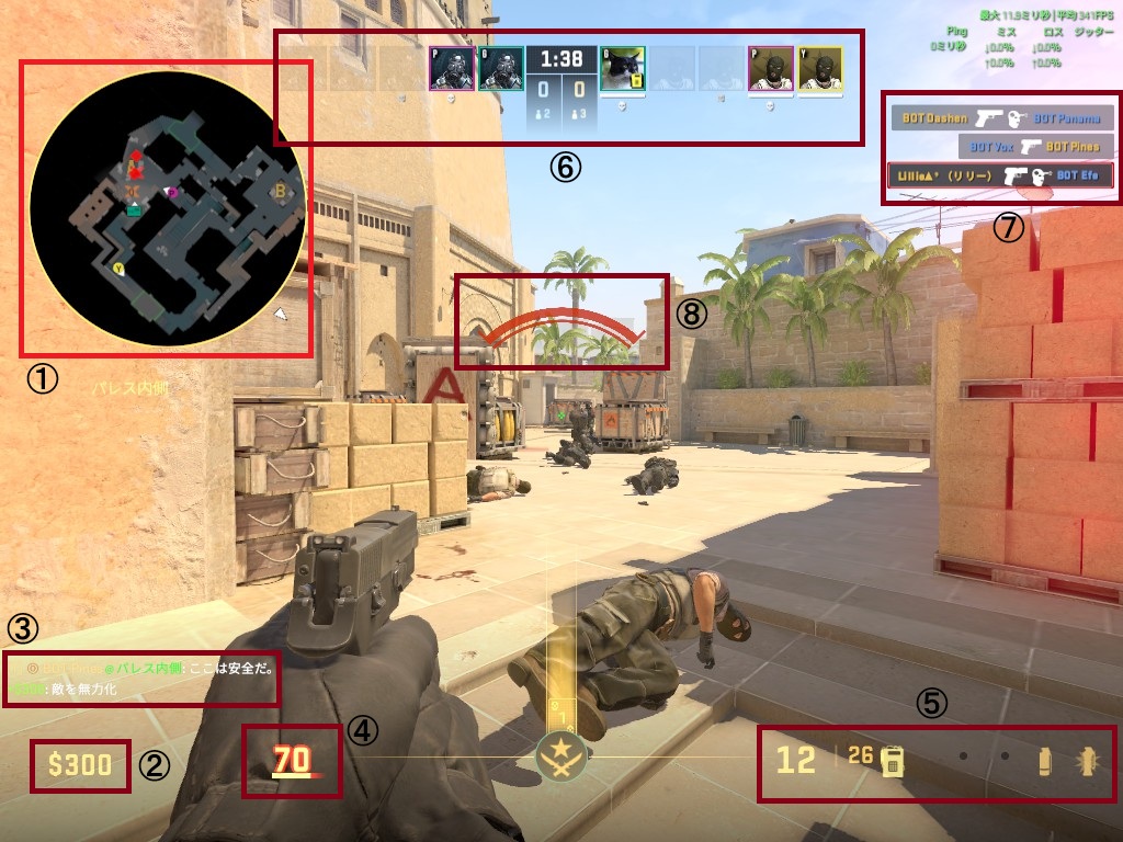 ソースの表示以前のリビジョンバックリンク文書の先頭へ 目次 ①レーダー ②所持金 ③チャット・ラジオメッセージ ④ヘルスバー ⑤残弾・予備弾数・所持武器など ⑥残り時間・残り人数・取得ラウンドなど コメント ⑦キルログ 画面の見方 ①レーダー ②所持金 ③チャット・ラジオメッセージ ④ヘルスバー ⑤残弾・予備弾数・所持武器など ⑥残り時間・残り人数・取得ラウンドなど ⑦キルログ コメント フルネーム: メールアドレス: コメントを入力: 人間の証明として、ボックス内の全ての文字を入力してください。 L A P U B この項目は空のままにして下さい: hud.txt 最終更新: 2025/11/22 17:24